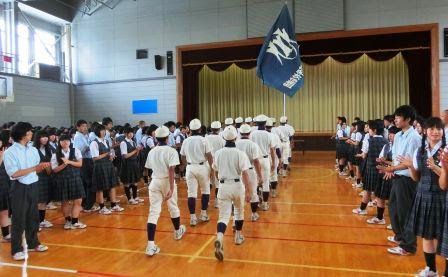 はじめに校長先生が、「全校生徒の想いをのせて、油断することなく、臆することなく、全力プレーで頑張ってほしい」と激励し、